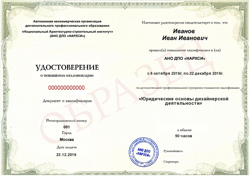 - Образец удостоверения о повышении квалификации.